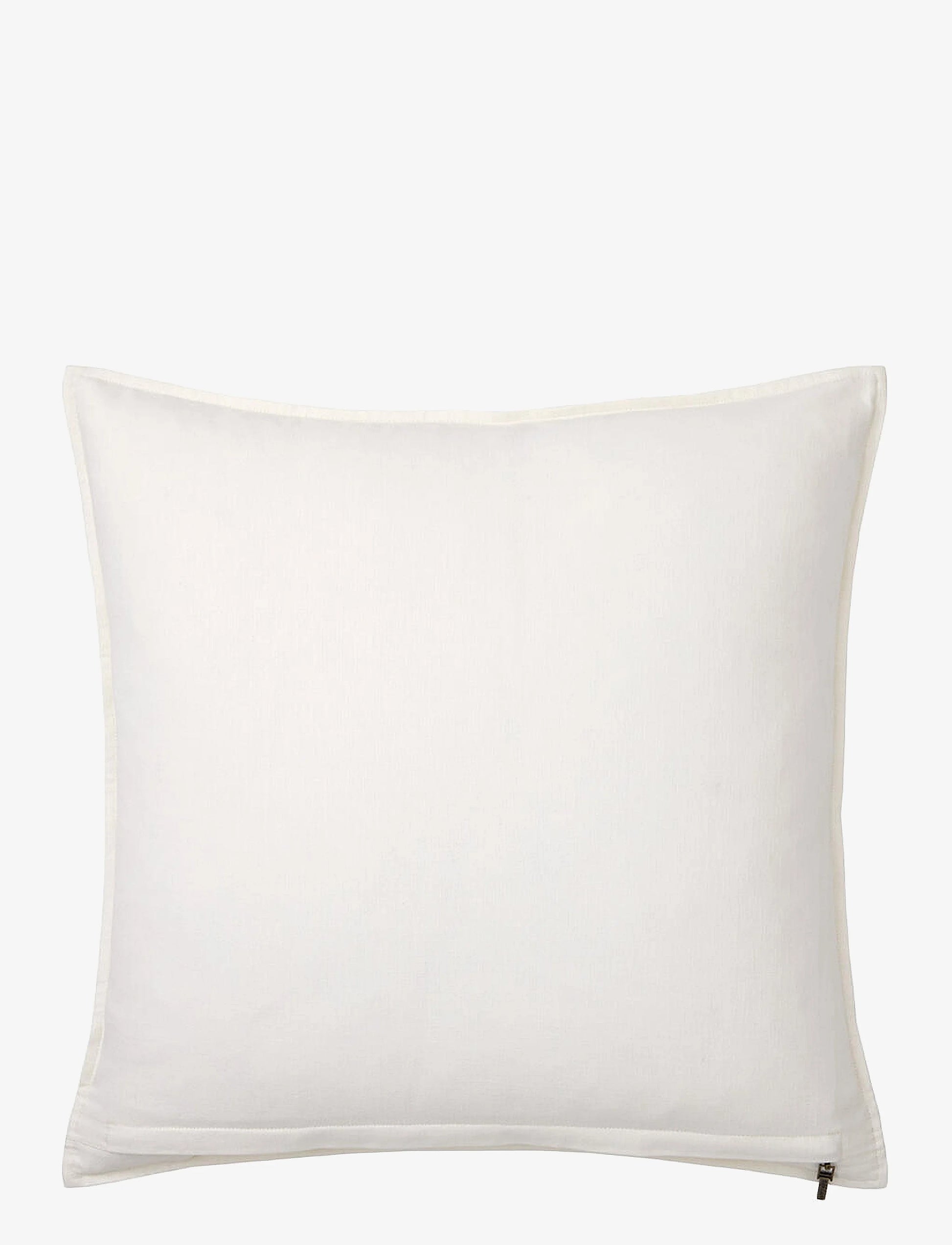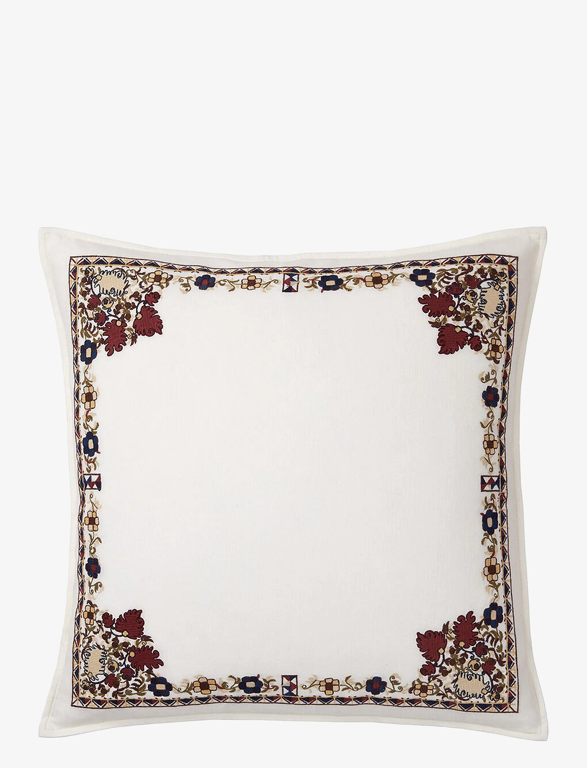 Fabricado con una mezcla de algodón y lino en un tono blanco crema, el fondo liso crea el lienzo en blanco perfecto para el elemento principal que es el bordado. 85% algodón, 15% lino; forro interior 100% algodón. Bordado floral, Forma cuadrada, Fondo blanco crema. Medida: 18 x 18 pulgadas