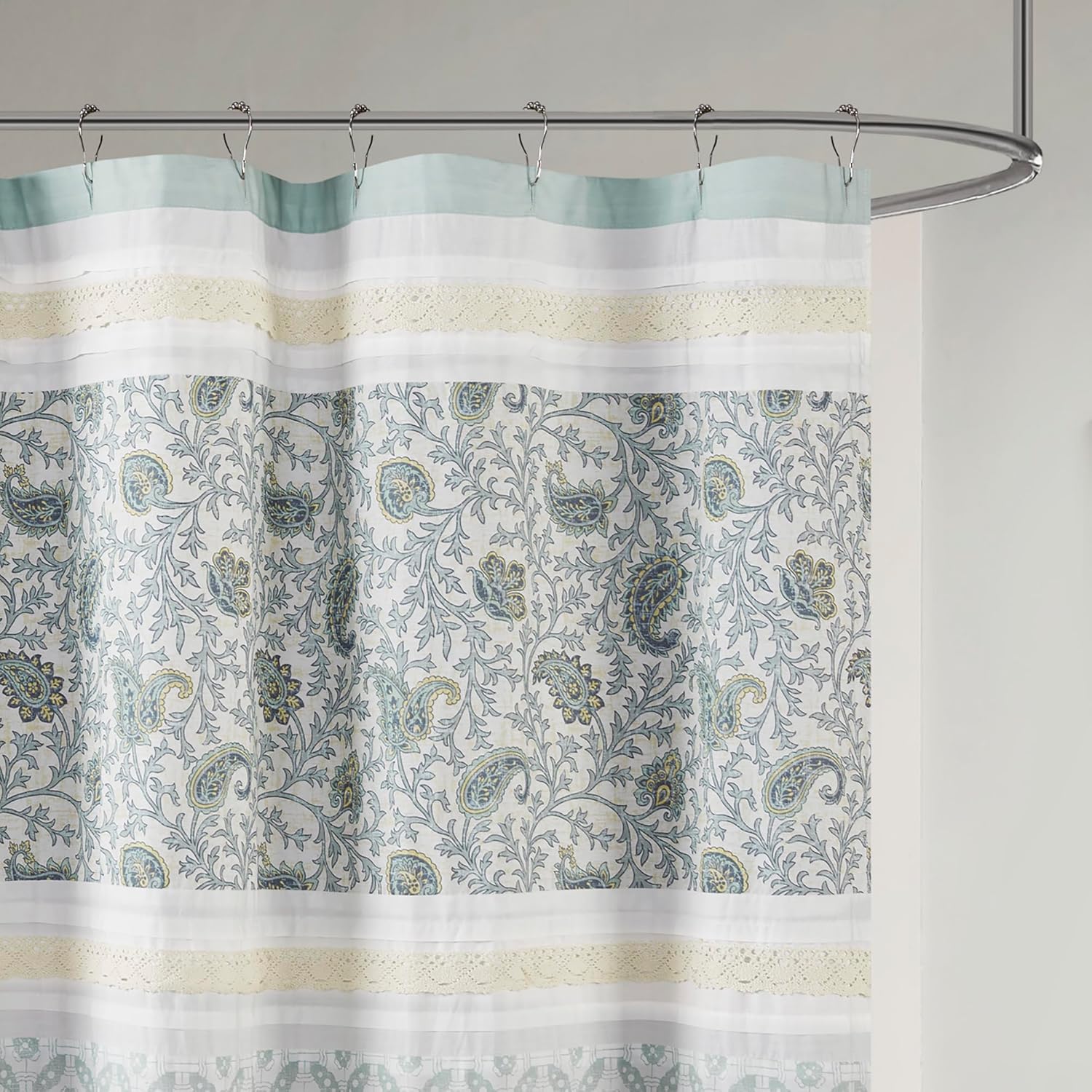 Para darle un toque encantador y elegante a tu baño, nuestra cortina de ducha de algodón Madison Park Dawn cuenta con todos los elementos perfectos para un estilo shabby chic a la perfección. Una mezcla de colores se imprime en un diseño paisley junto con una tela blanca con pliegues, separada por una hermosa cinta de encaje.