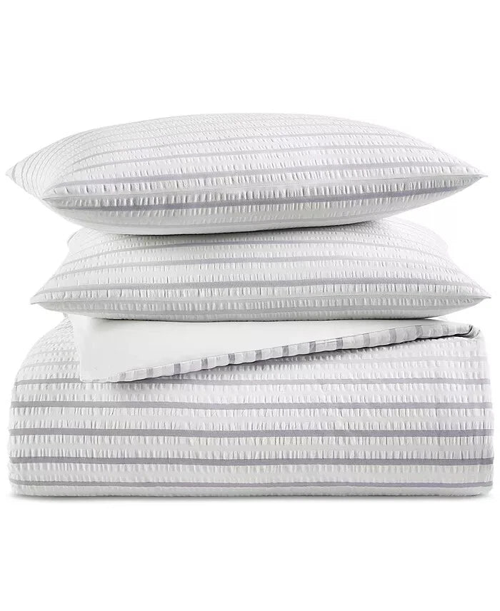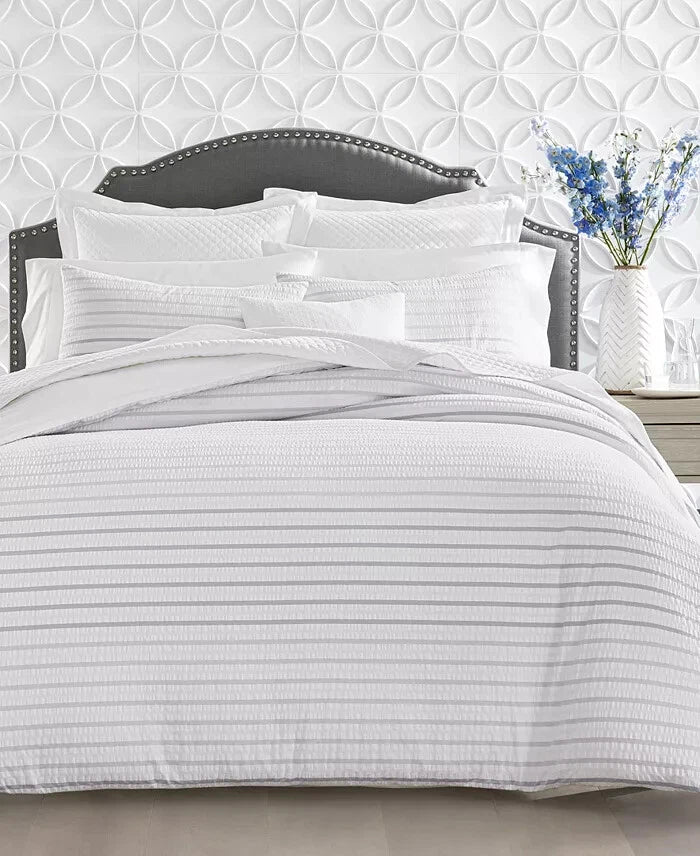 Dale a tu dormitorio un nuevo nivel de estilo y comodidad con el juego de cama de rayas de Damask Designs de Charter Club. Con un diseño de rayas Ombré en tonos azules y grises, sobre una suave tela de algodón blanco, este look es ideal para cualquier dormitorio.