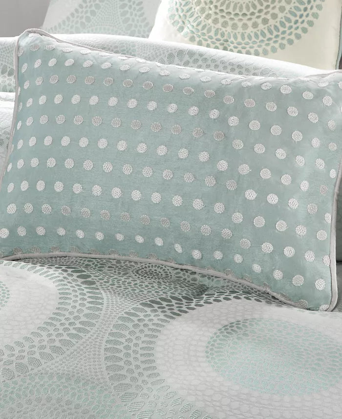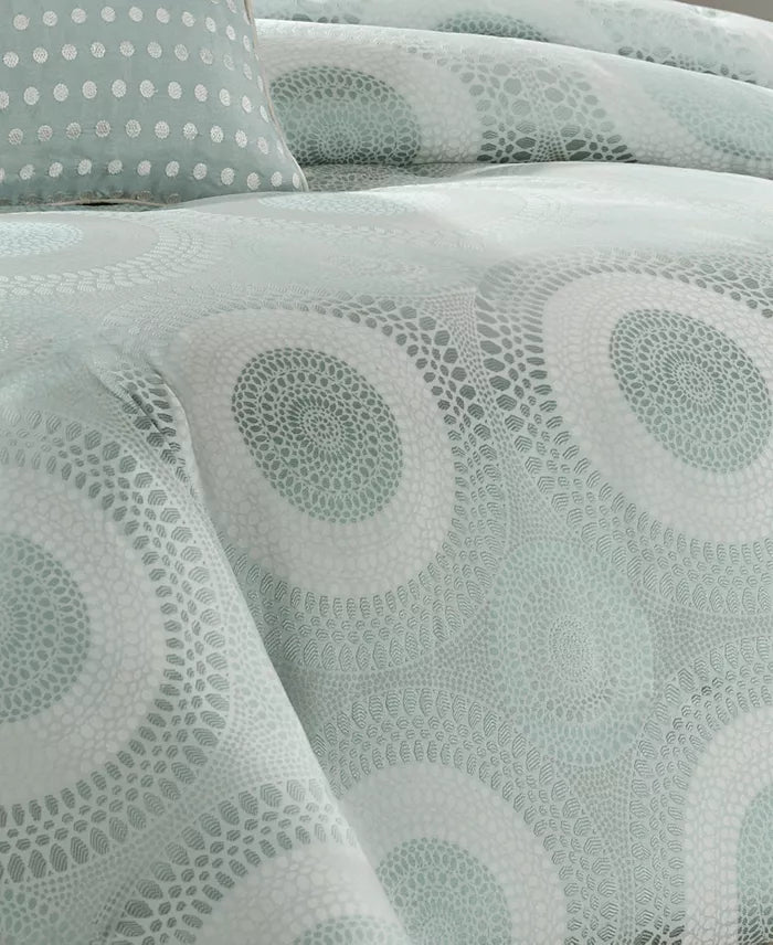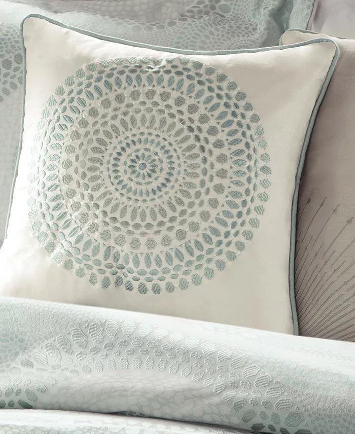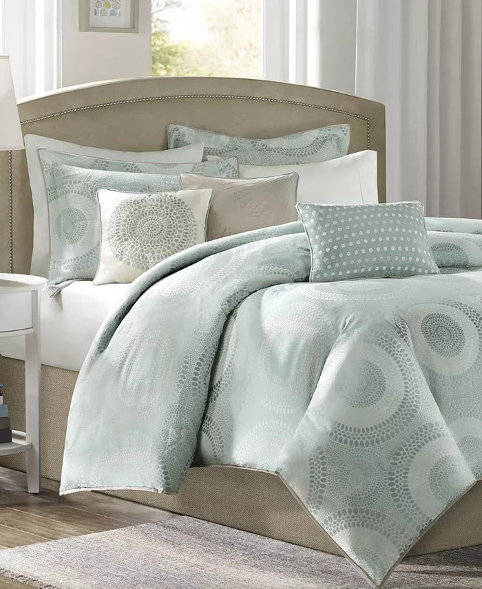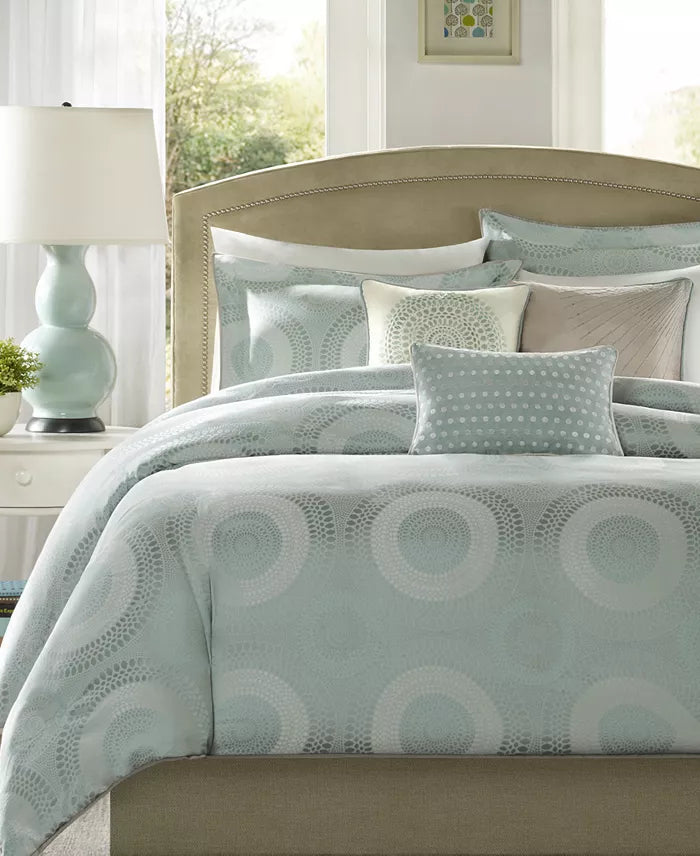 El jacquard con medallones estilo mosaico y los vibrantes detalles en azul espuma de mar de los juegos de cama Baxter de Madison Park aportan a cualquier dormitorio un aire moderno y refrescante. Incluye cojines decorativos, fundas de almohada y un faldón a juego, este conjunto cuenta con todo lo necesario para un look impecable.